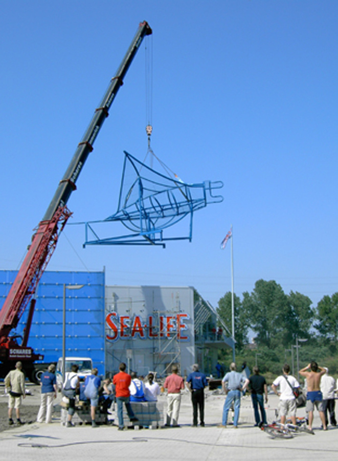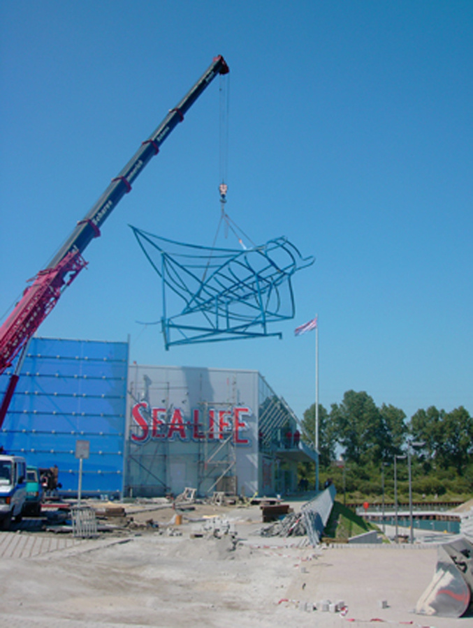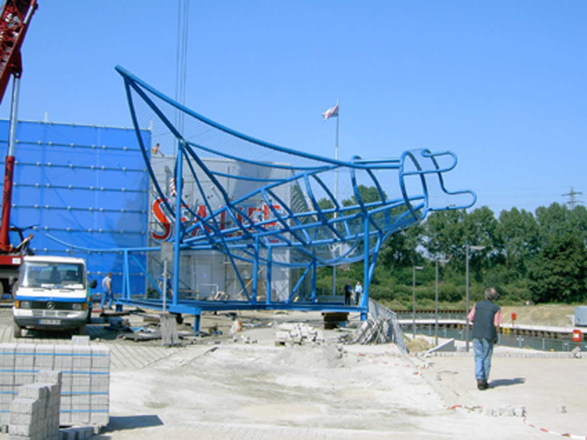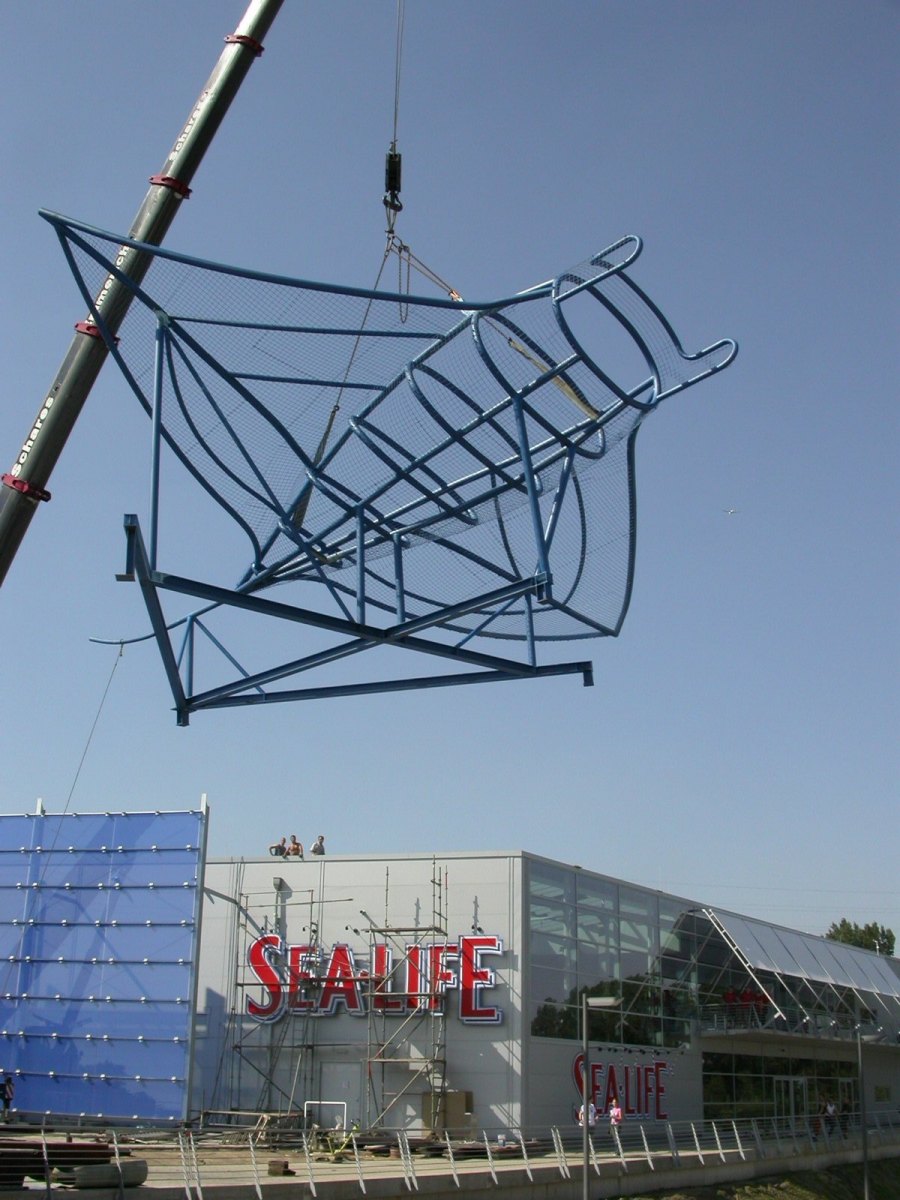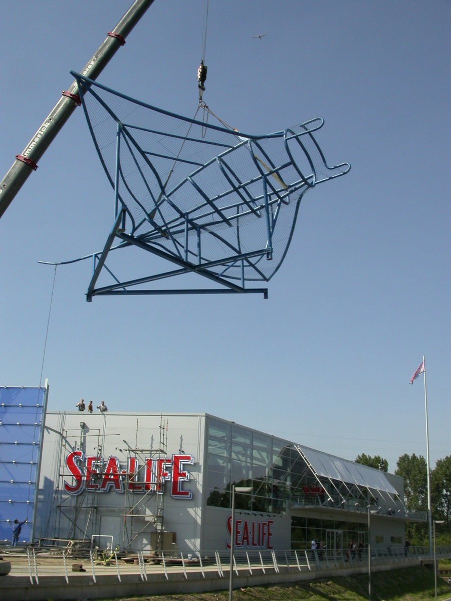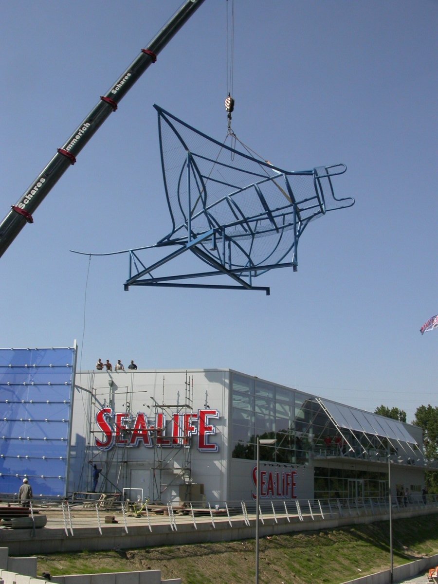 Das Architekturbüro Jokiel aus Düsseldorf beauftragte mich im Jahr 2003 mit der Gestaltung des Manta Rochen. Die Stahlplastik steht seidem auf dem Dach des Sealife Center in Oberhausen.