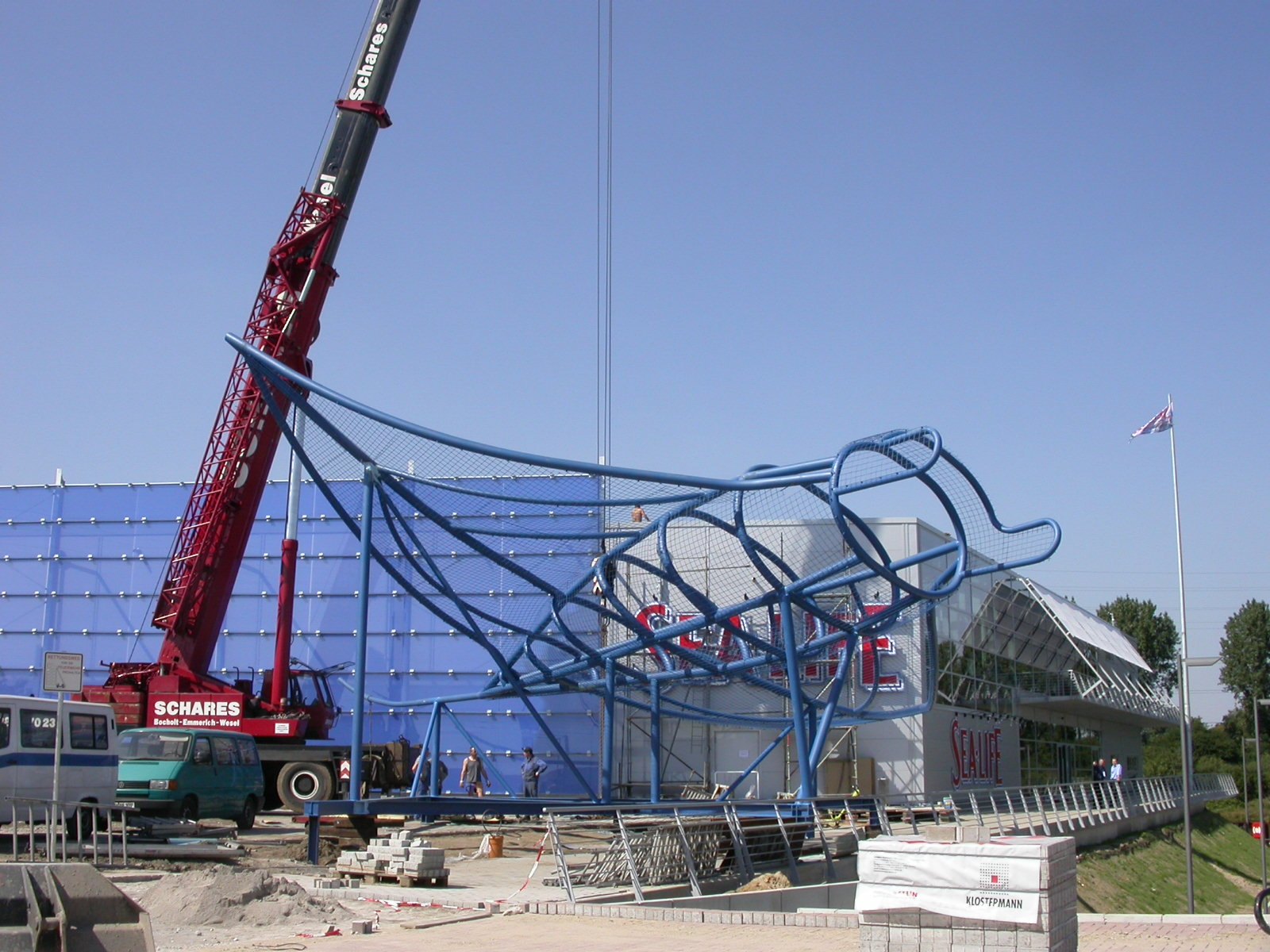 Stahlrohrkonstruktion: 10 m Höhe, 20 m Breite und 25 m Länge, 10T Gewicht. Rohre in Kaltbiegetechnik verformt. Trägersäulen 15 m hoch. Gitter aus Baustahlmatten.