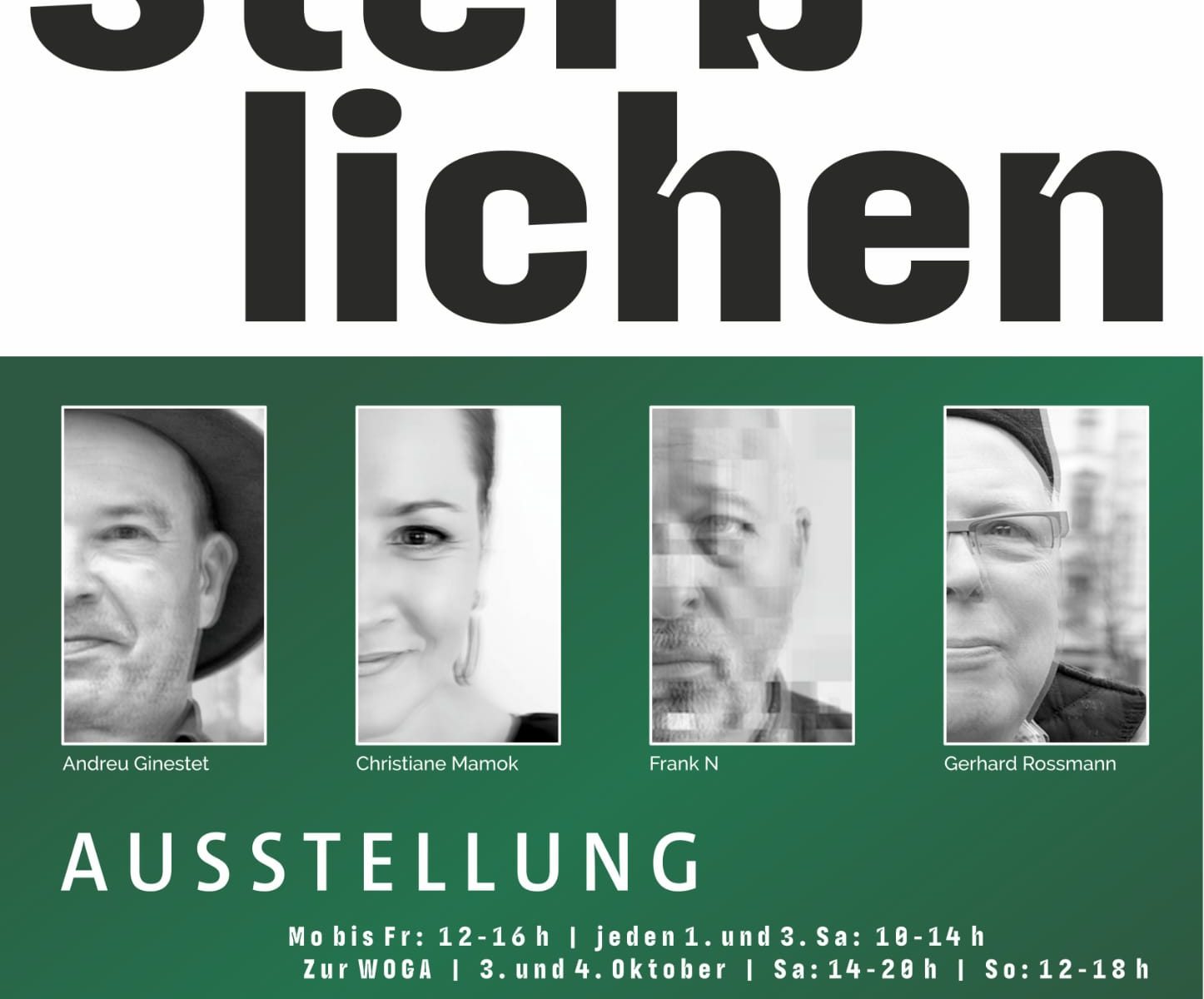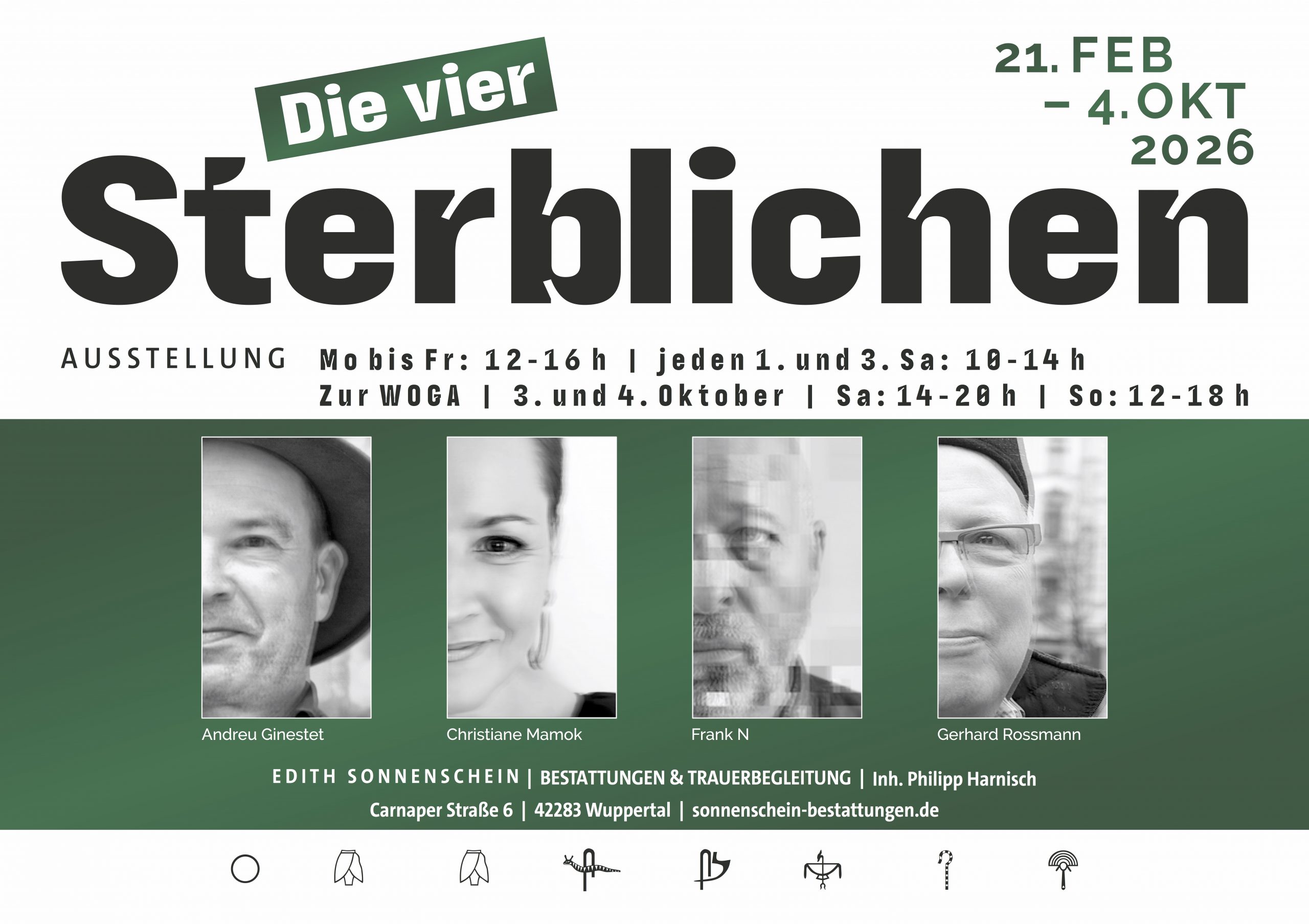 Unter dem Titel „Die vier Sterblichen“ versammeln sich die vier Kunst-schaffenden Christiane Mamok, Andreu Ginestet, Frank N und Gerhard Rossmann zu einer gemeinsamen siebenmonatigen Ausstellung in den Räumen des Bestattungsinstituts Edith Sonnenschein.