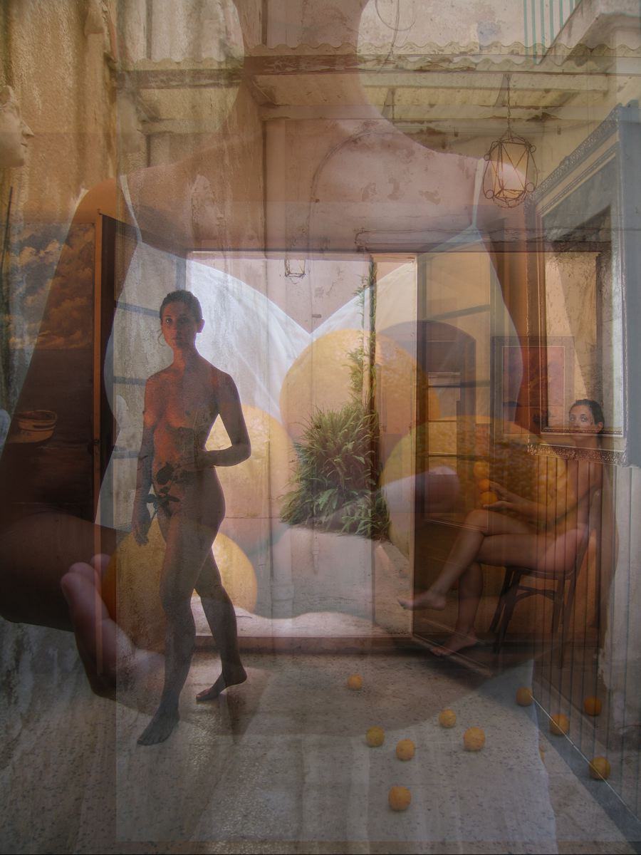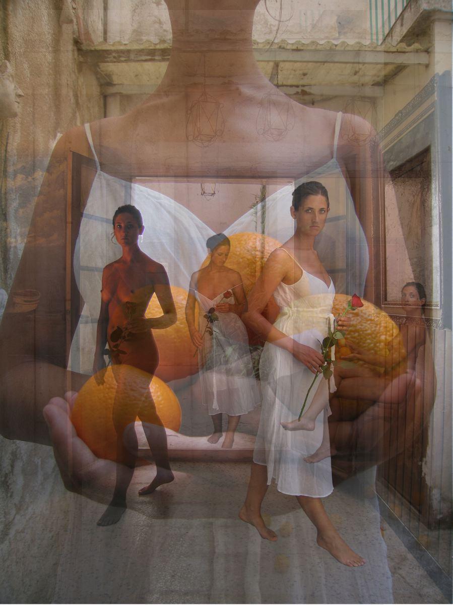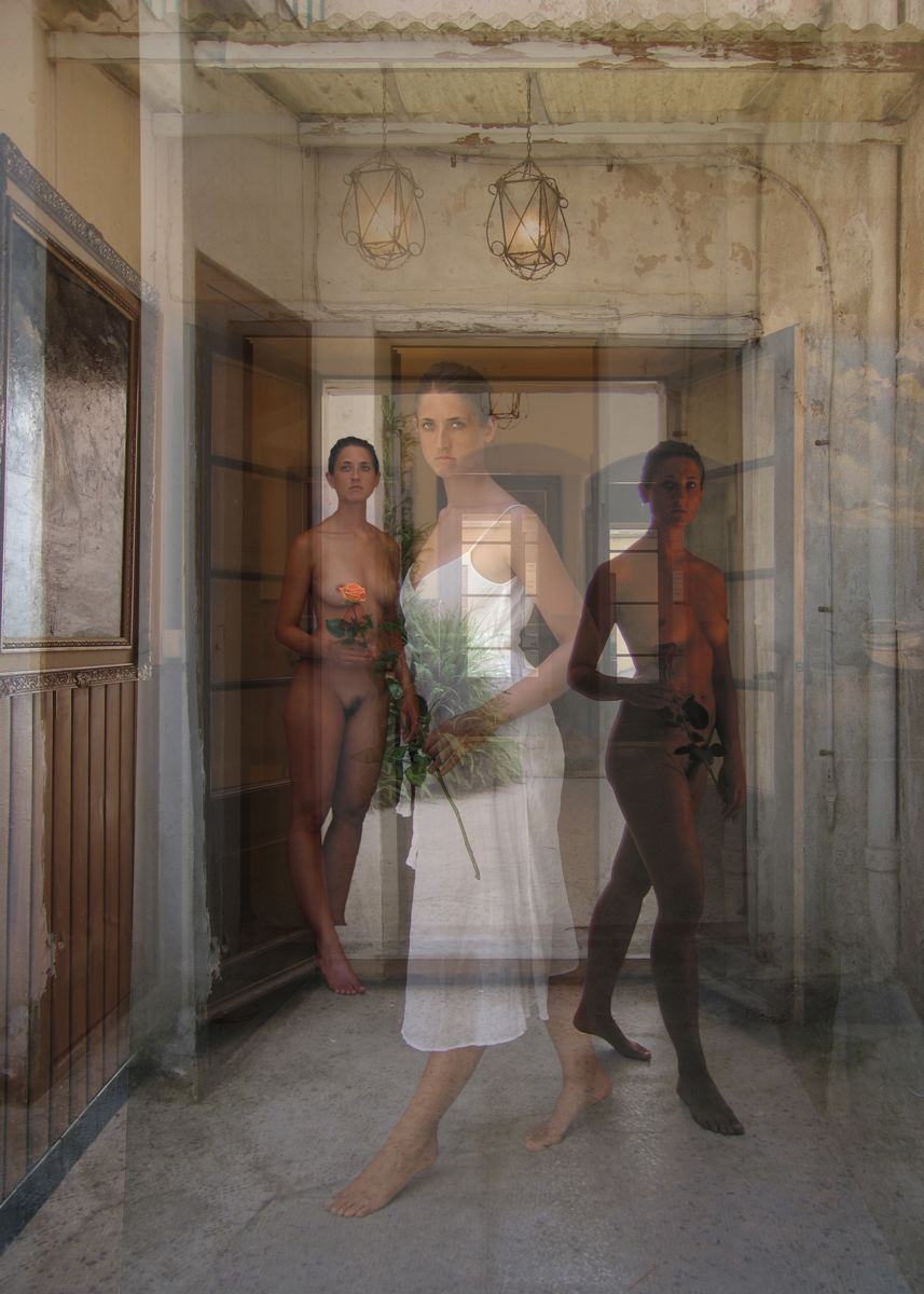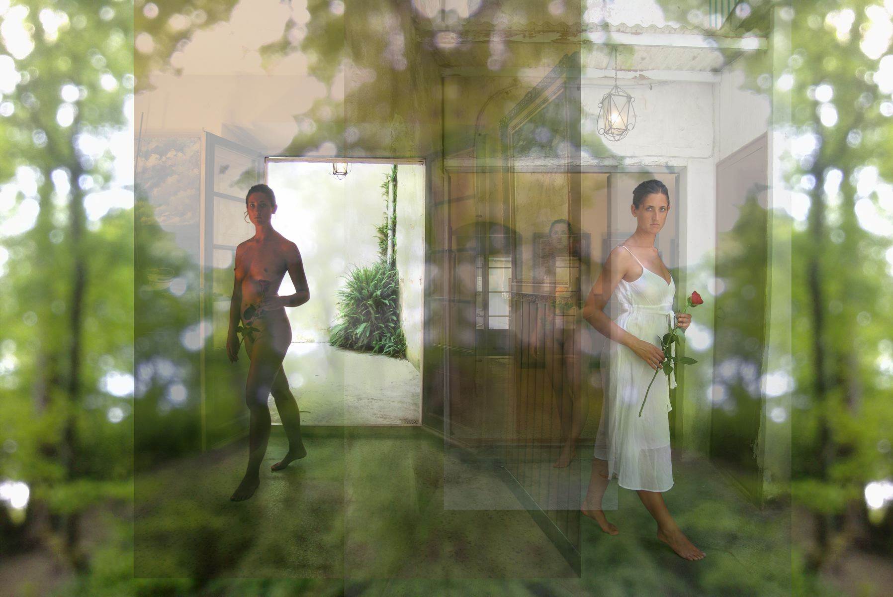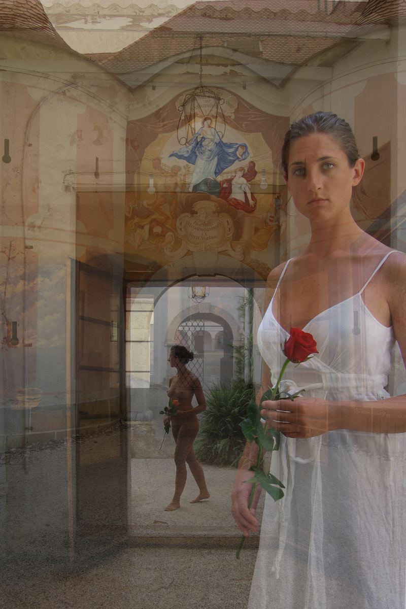 Die Bilder entstehen in einem Setting dass mein Atelier mit einem paradiesischen Garten, einem Ort in der Natur oder einem sakralen Ort verbindet. Jeder gewählte Ort hat eine Bedeutung im Gesamtwerk