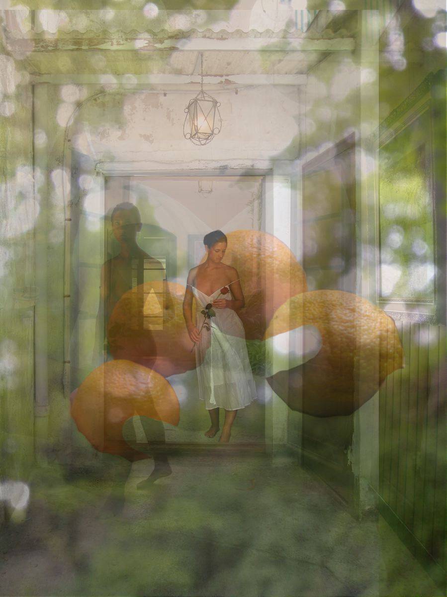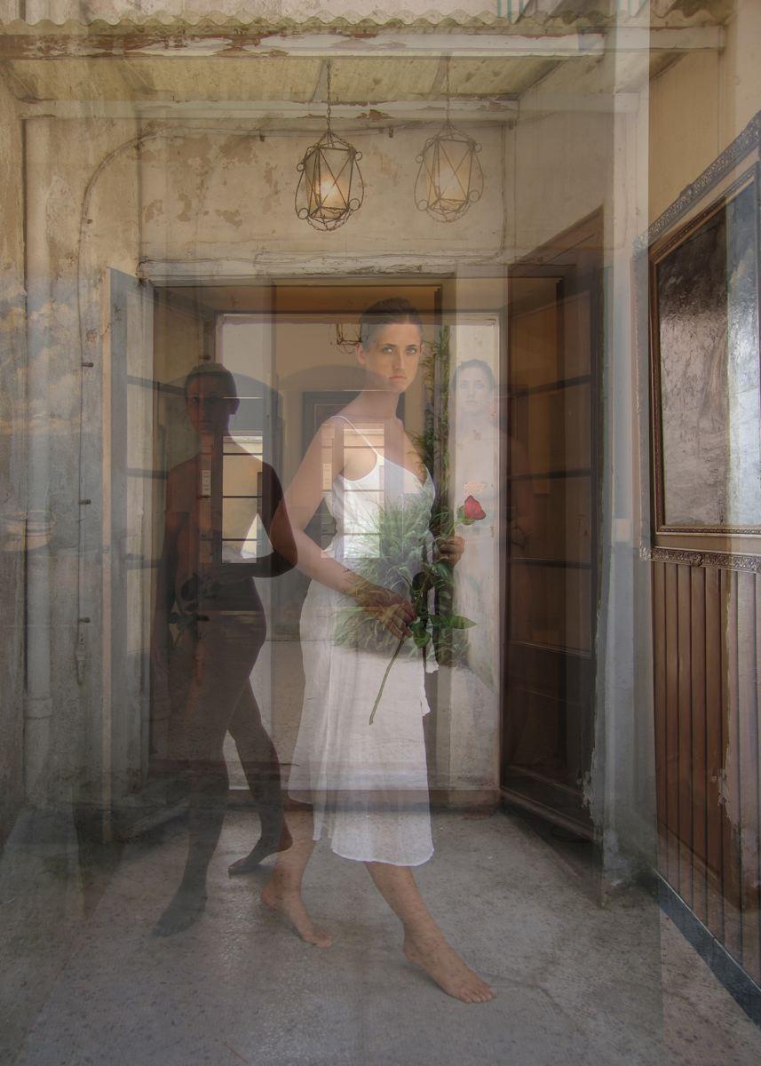 Der Titel dieser Arbeit lautet „Flor de Luz“ oder „Lichtblüte“. In diesem Bild zeige ich, dass bei der Überlagerung der zwei Perspektiven eines Körpers eine neue Form entsteht. Diese neue Form beinhaltet in diesem Fall zum Beispiel ein Herz, der sich aus den sich kreuzenden Oberarmen entsteht. Die ganze Form sieht aber aus wie ein Blütenkelch. Da Fotografie nur Licht ist, nenne ich diese Form wie eine Blüte die aus Licht entstanden ist.
